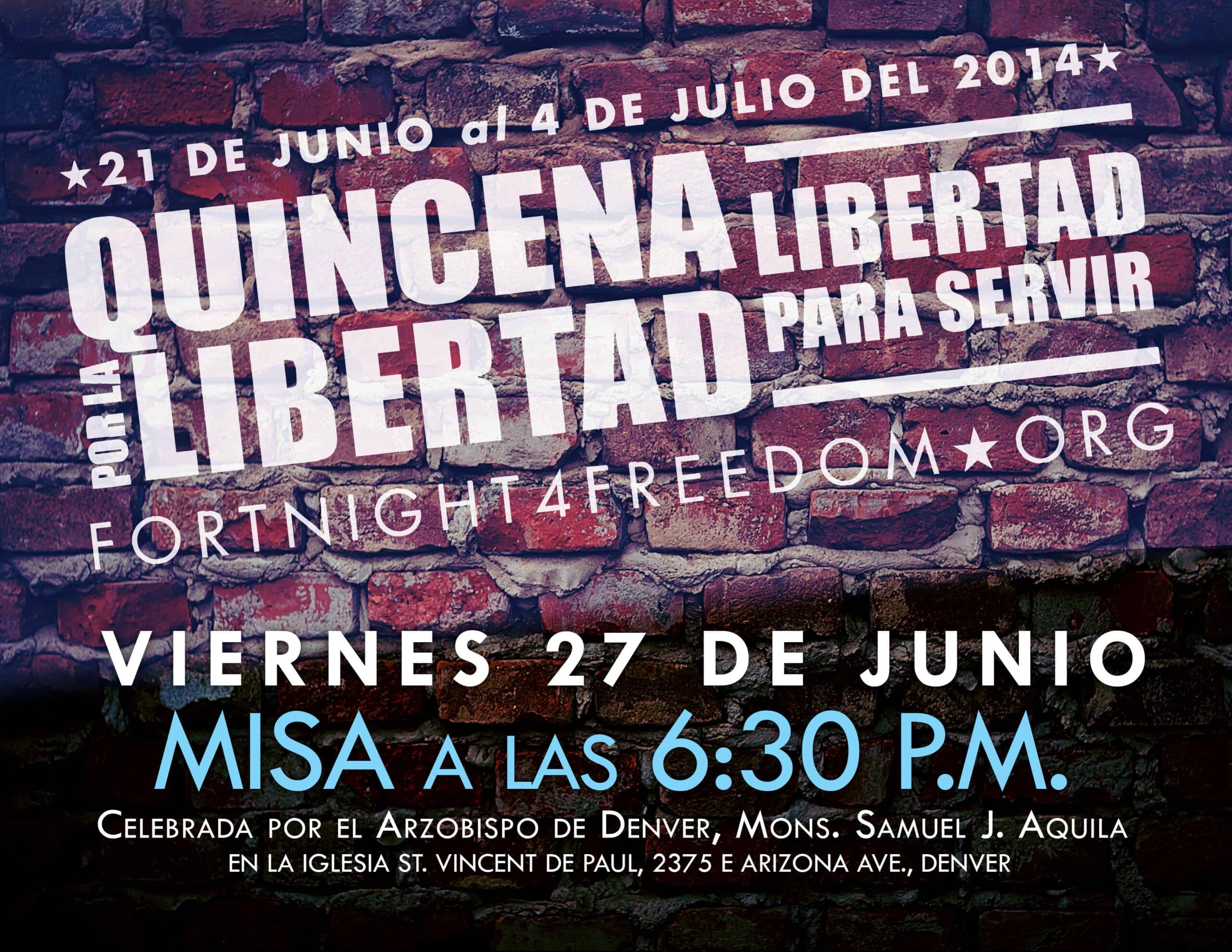 Este viernes 27 de junio a las 6:30p.m. en la parroquia St. Vincent de Paul en Denver , el Arzobispo Samuel J. Aquila, presidirá la celebración de la Eucaristía para rezar por el respecto de los derechos de consciencia y la libertad religiosa en Colorado.