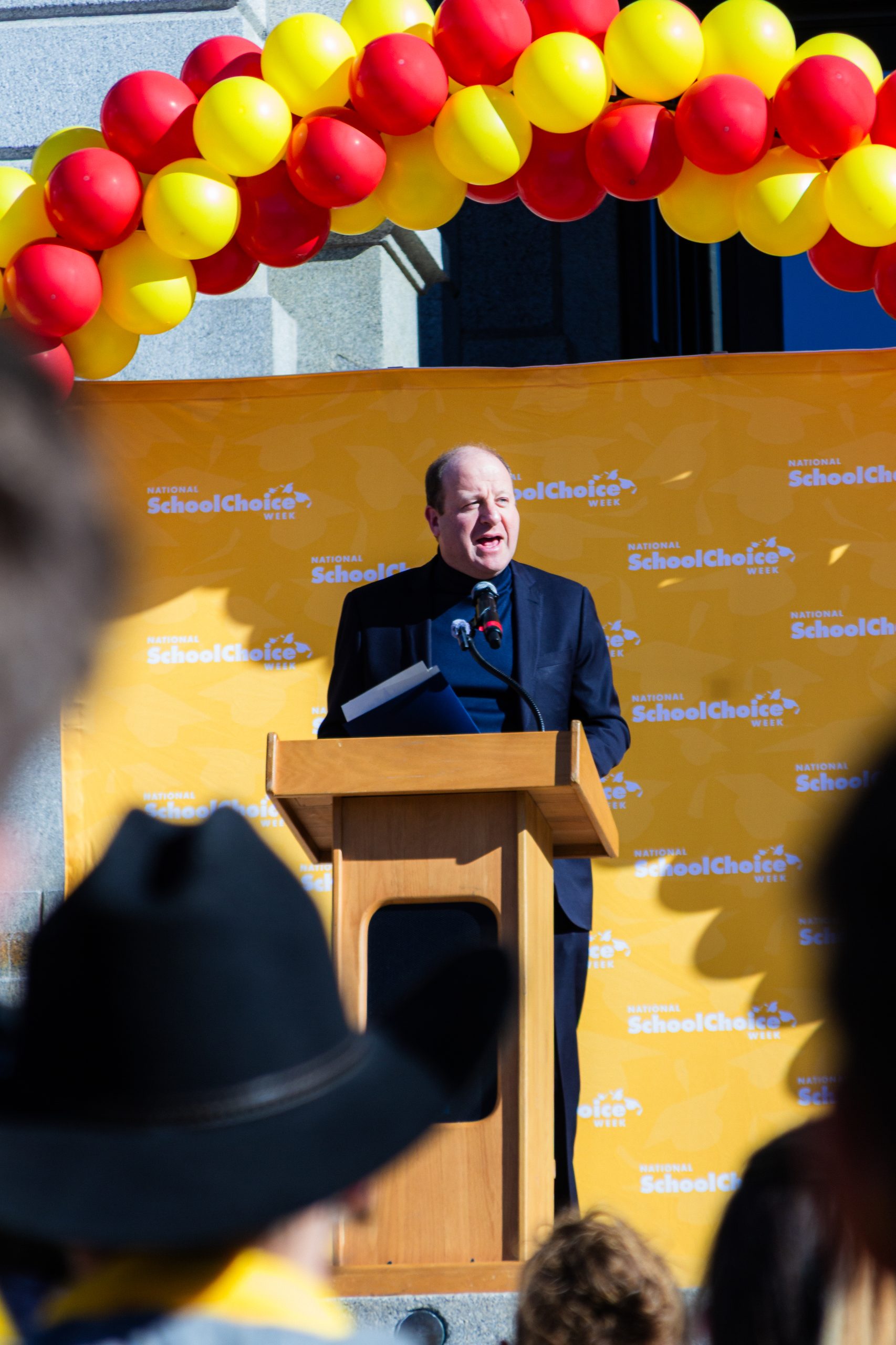 El gobernador estuvo presente para leer una proclamación que oficializa el Día de la Elección Escolar en Colorado, pero se mostró aún más entusiasmado por su decisión de sumarse al nuevo programa federal de becas mediante créditos fiscales aprobado por la administración Trump.