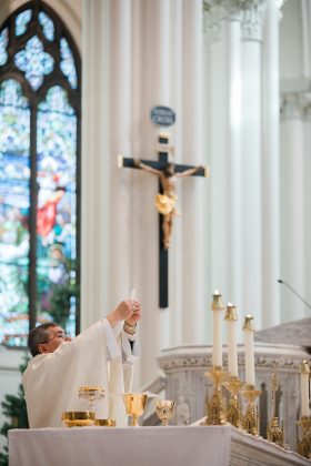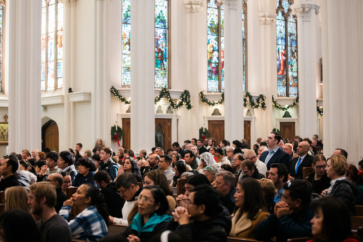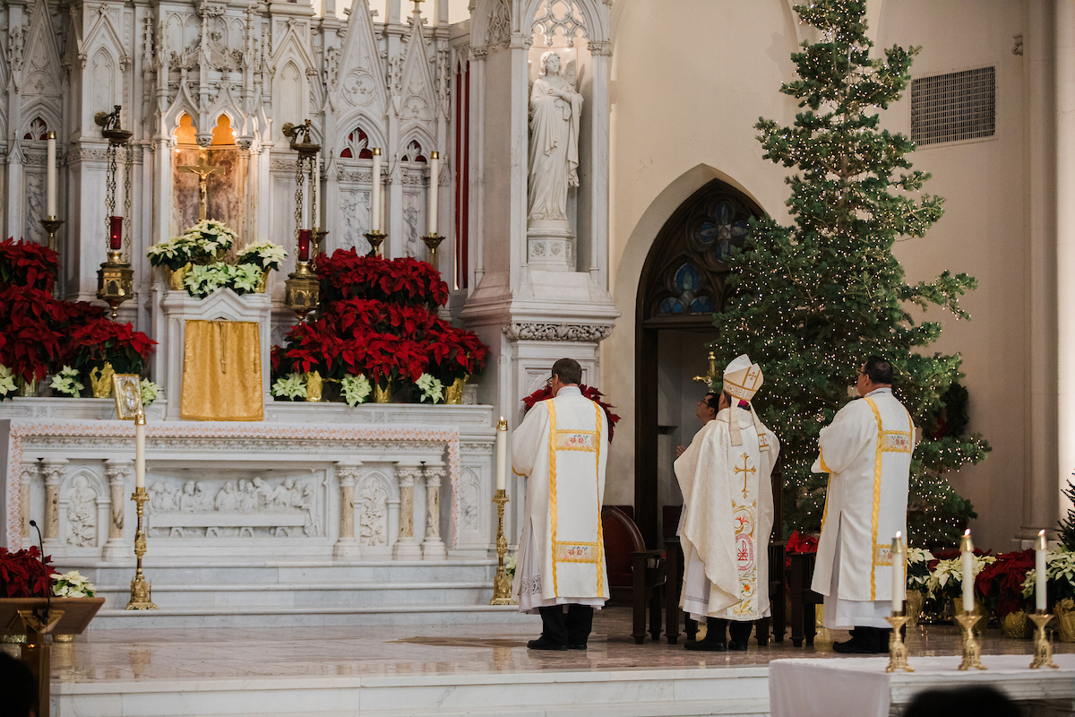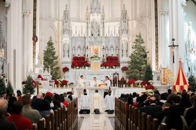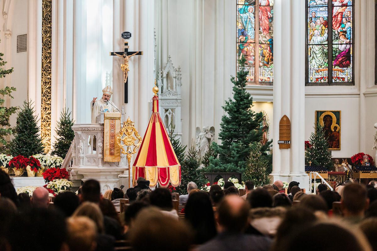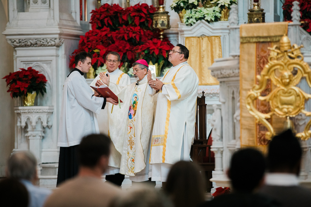 Mientras los fieles se acomodaban en las bancas antes de la Misa en el último domingo del 2025, un seminarista aguardaba al fondo de la catedral, bajo el dosel rojo y amarillo del ombrellino de la Catedral Basílica de la Inmaculada Concepción.