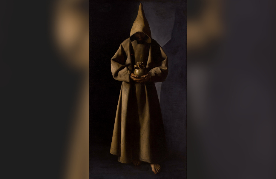 La oscuridad de esta pintura les da a los pensamientos del santo una seriedad que cala hasta los huesos. Francisco y la calavera no reconocen al espectador, sino que se miran directamente el uno al otro, absortos, en la intimidad profunda del momento. Aunque la calavera es físicamente ligera al descansar en sus manos santas, en la pintura carga un peso espiritual inmenso. Sus rasgos faciales no importan. No importa qué tan hundidos o cercanos estén sus ojos, cuántas arrugas tenga su piel, qué tan grandes o pequeños parezcan sus oídos. Un día estará en su tumba, como tú y como yo lo estaremos: será una calavera. Tu rostro o el mío podrían estar igual de bien bajo ese hábito con capucha. Y ese es el punto. Aunque no parece notarnos ni ir a ningún lado, ese pie adelantado sugiere que el santo está dando un paso hacia nosotros. ¿Quizá para invitarnos a la misma meditación? Quizá para decirnos: “Mira, amado espectador, al entrar en mi tumba, del polvo venimos y al polvo volveremos”.