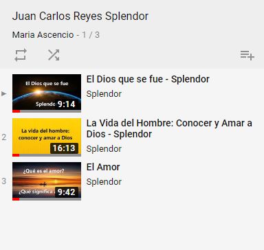 Además de “Sangre y agua”, Juan Carlos, meses antes de morir, había iniciado su propio canal en YouTube llamado Splendor. Su plan era subir un video mensual para explicar algunos puntos de la fe de la Iglesia: “Creemos que la fe católica es hermosa, que la fe en Jesucristo transforma la vida de cada persona (…) No es justo que esta fe no sea conocida”, dijo Juan Carlos al comenzar este nuevo canal. Debido a su enfermedad y posterior muerte, Reyes subió solo tres videos a Splendor.