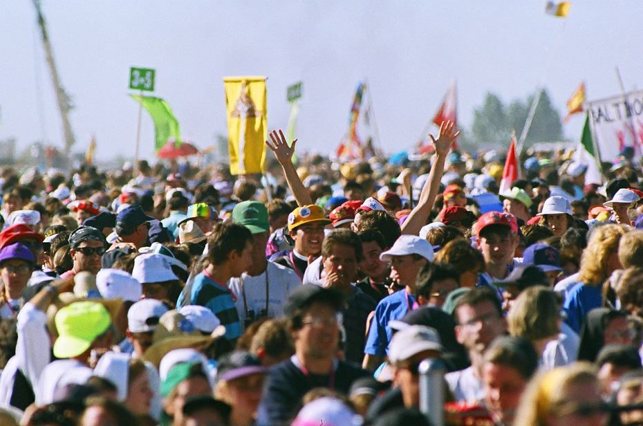 Miles de jóvenes peregrinos pasaron la noche en Cherry Creek State Park para la vigilia del Papa Juan Pablo II y la misa celebrada al día siguiente. Para llegar a este destino tuvieron que caminar unas 17.5 millas.